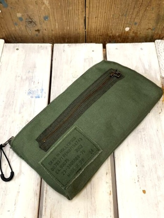 Grab In Hollywood/グラブインハリウッド、デッドストックのUSランドリーバッグをリメイクしたウォレットポーチです。 アメリカのカリフォルニア発祥の Grab In Hollywood、現在は日本国内での生産で、カットソーやバッグなどを手掛けているブランドです。 ミリタリーのランドリーバッグを解体してリメイクの上生まれ変わったウォレットポーチ。 お札はもちろんスマホ、通帳、パスポートなどが収納できます。 カード類も6枚入ります。 外側のファスナー付きポケットはコインケースとして使用可能。 背面には元々のランドリーバッグに押されているステンシルがランダムに配置されています。 (個体によって異なります) 見た目より収納力抜群です!! [ご注意] リメイクですのでスタンプやボディの濃淡などに個体差があります。 予めご了承ください。 Color:Army Size:高さ 13cm、幅 21cm、マチ 2cm ※多少の差異はご容赦ください。 ※Made In Japan