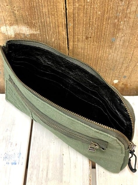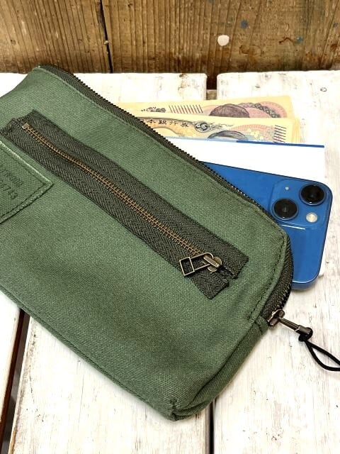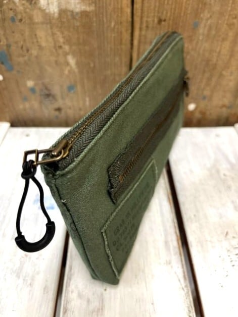 ミリタリーのランドリーバッグを解体してリメイクの上生まれ変わったウォレットポーチ。