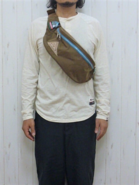 表地には軽量で強度のあるコーデュラナイロンを使い、ボディ、ショルダーストラップ、そして三角形のオリジナルネームタグまでブラウン系で統一されています。