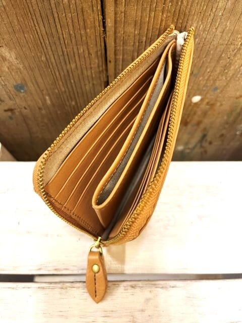 L字型のジップを開けると、真中に小銭入れ、左右に紙幣他領収証等、その隣に計6枚のカードスペースとフリーポケットとして利用可能なスペース有り。