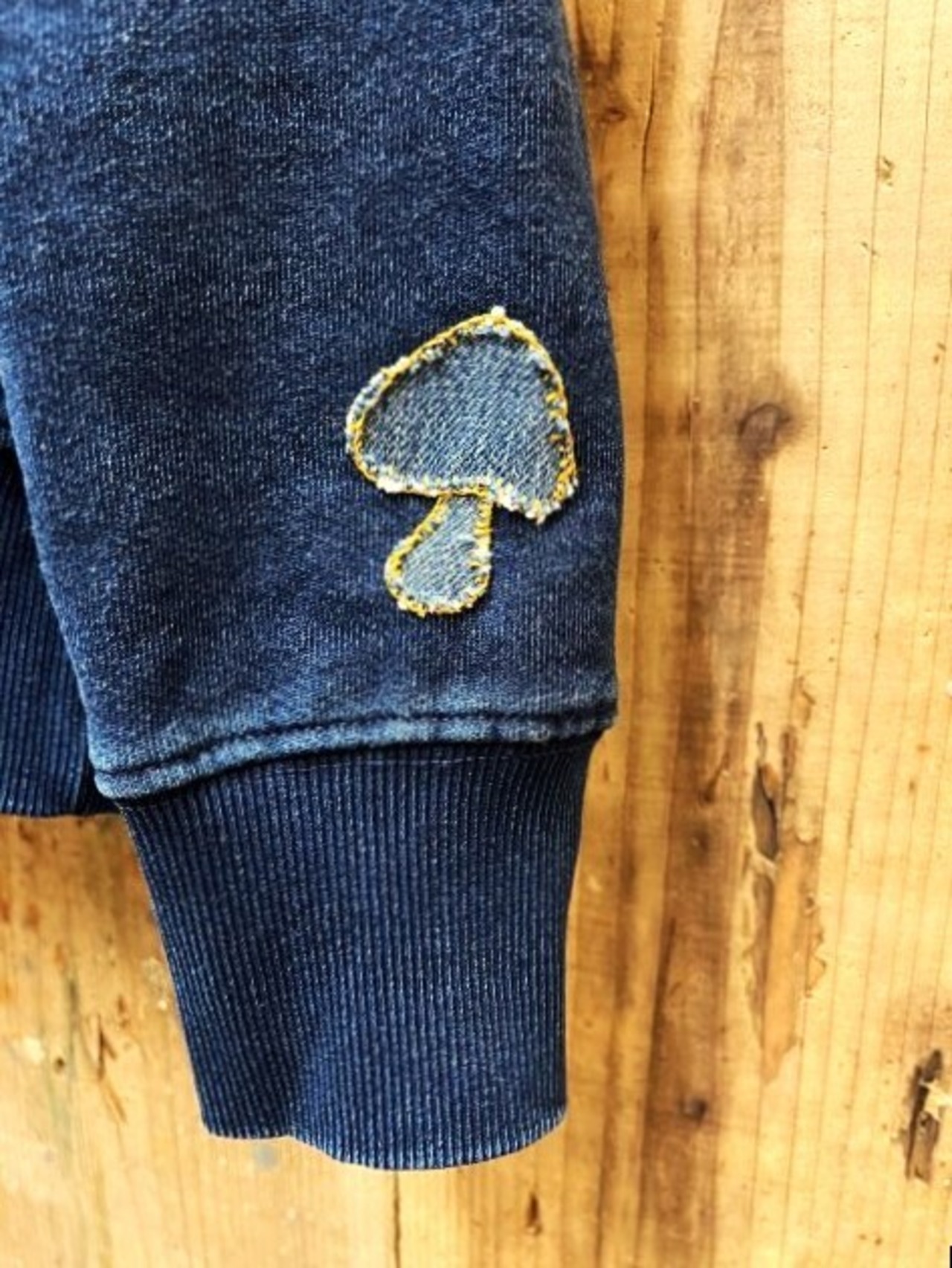 12.2オンスのしっかりしたインディゴ染めのスウェットにパッチワーク&リペア風のリメイク加工を施しております。