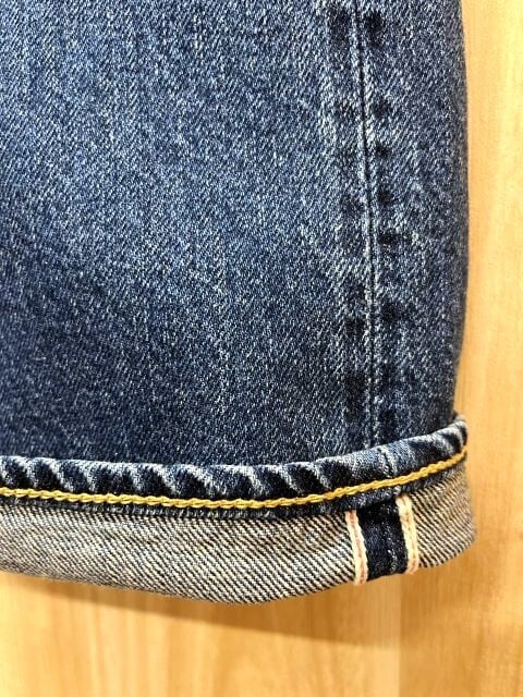 アメリカ綿そしてオーストラリア綿をブレンドしたムラスラブ糸を使用し、ピュアインディゴ100%のロープ染色で染め、TOYODA製の旧式シャトル織り機で織られた12ozのセルビッジデニム。