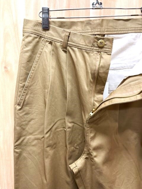 ツータック入りで股上もしっかりと深め、腰回りに十分なゆとりがあり、ワイドなまま裾に向けてややテーパードしたベーシックなチノパンツです。