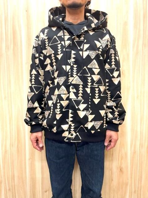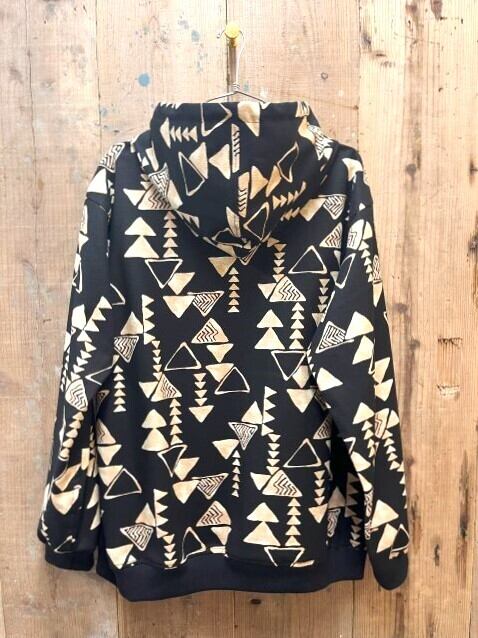 ブラックベースの渋めの柄に対してリブやボタン・フードの紐もブラックで、大人っぽい仕上がりです。