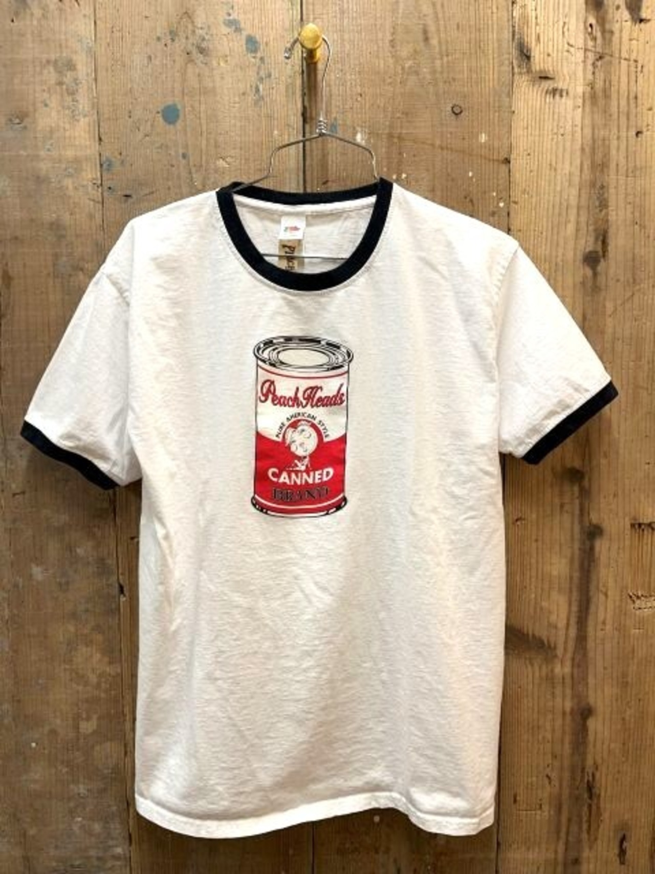 当店のオリジナルキャラ Peach Headsより、ネックと袖口がトリムになった“ピーチ缶”リンガーTシャツです。